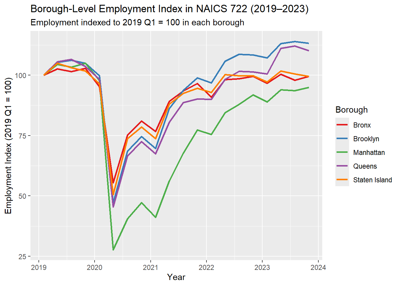 Borough recovery patterns differed, with some areas experiencing deeper declines and slower rebounds than others. (See the individual report for borough detail.)