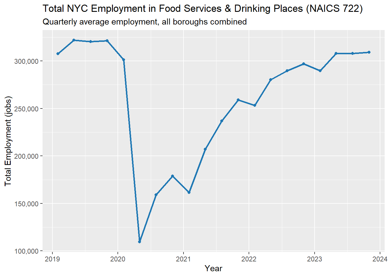 - Bureau of Labor Statistics QCEW (NAICS 722): Quarterly employment data for Food Services & Drinking Places (2019–2023).