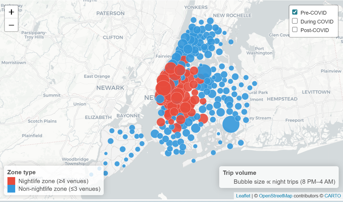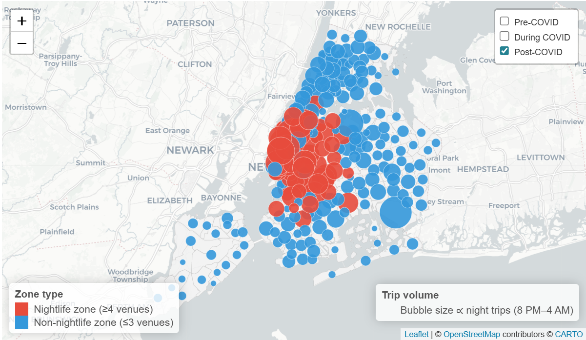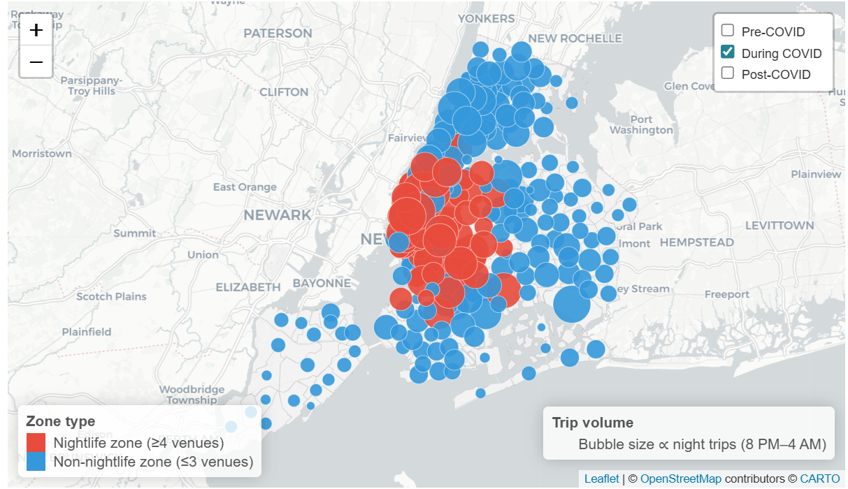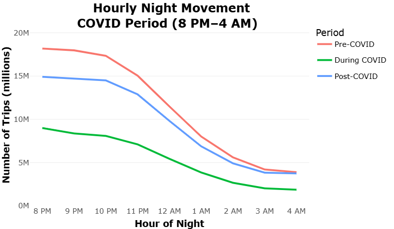 - Post-COVID Mobility: Has COVID changed the way the city moves at night (8 PM–4 AM)?
