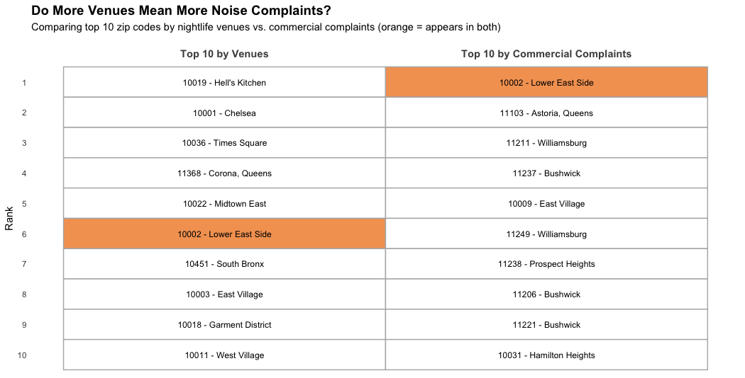 Figure 3: Top 10 ZIP codes by venue count vs. noise complaints
