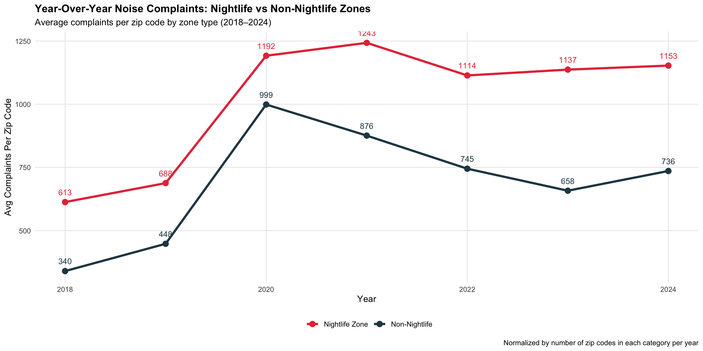 Across 2018–2024, nightlife-heavy ZIP codes consistently generate substantially more noise complaints than more residential ZIP codes, and the gap persists over time.
