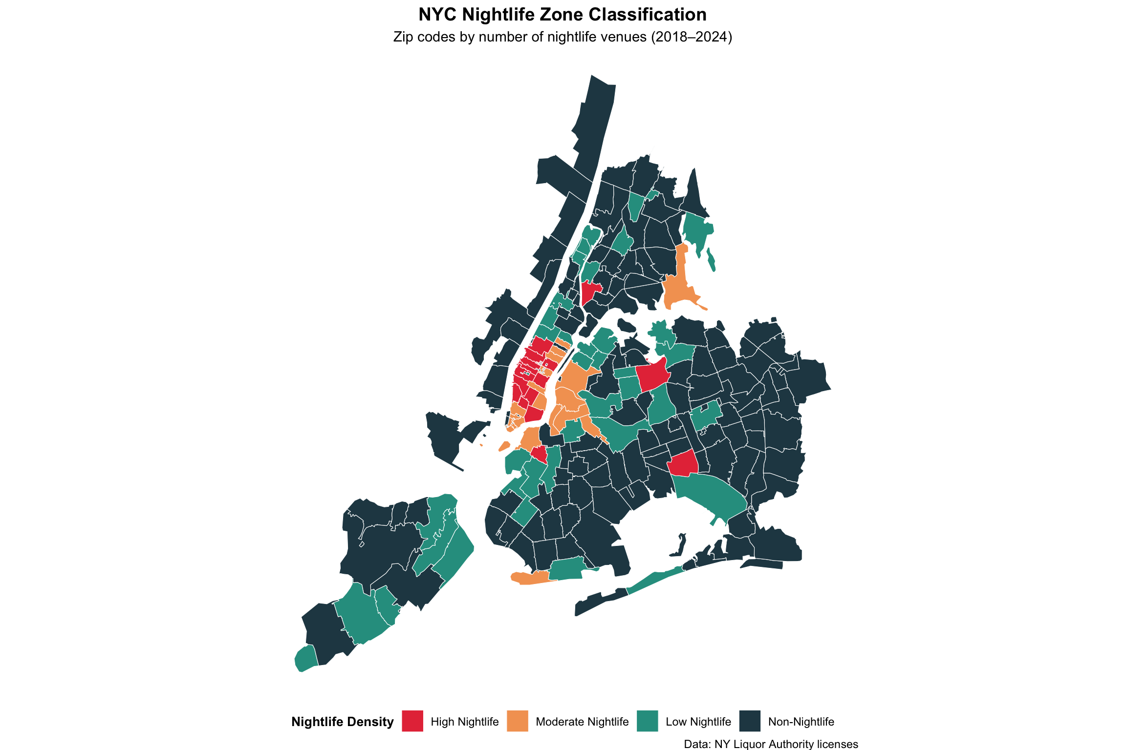 - NY State Liquor Authority (SLA): Licensed premises data mapping nightlife venue clusters and distinguishing nightlife-heavy from residential areas.