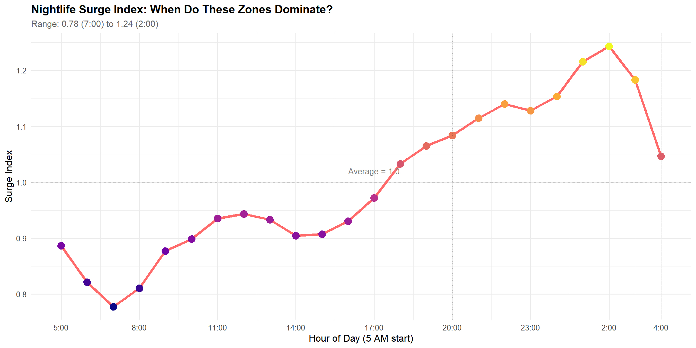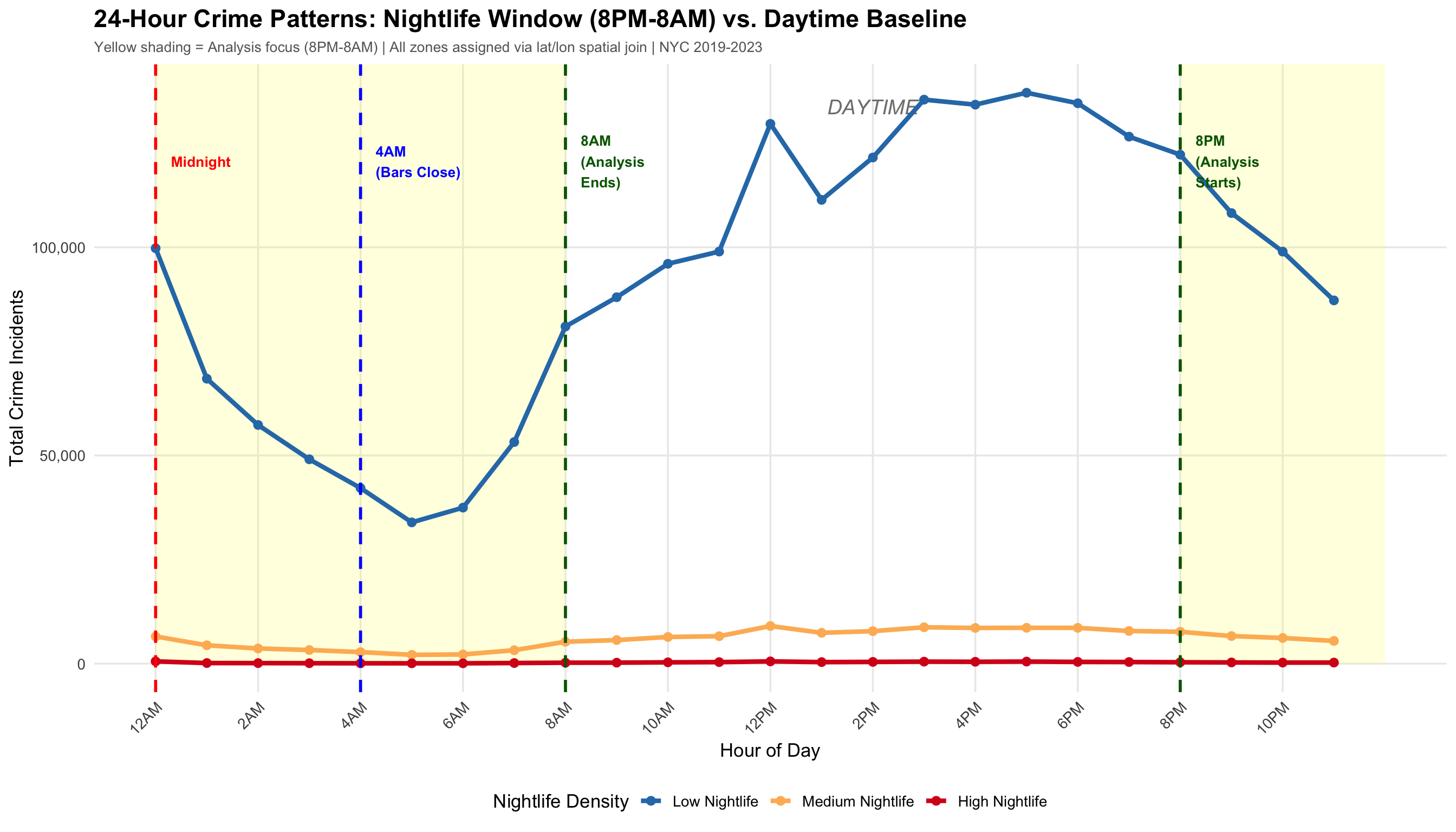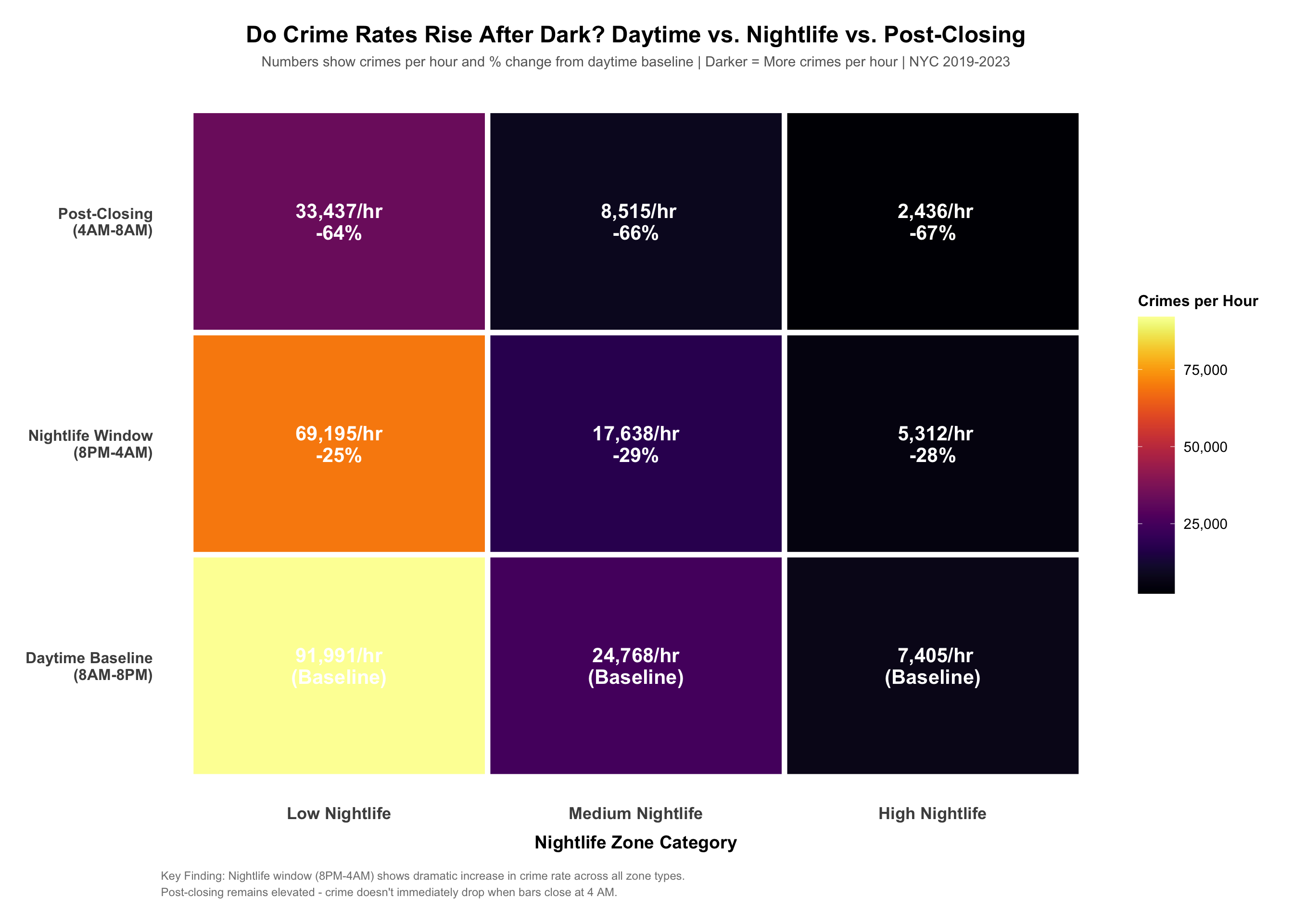 The 78 nightlife-heavy ZIP codes generate 1.5-1.8x more noise complaints while capturing 26% of nighttime rideshare revenue and employing 56% of Manhattan’s nightlife workforce. Crime spikes 30-40% after midnight but drops 32-44% after 4 AM closures—a predictable 4-hour intervention window.